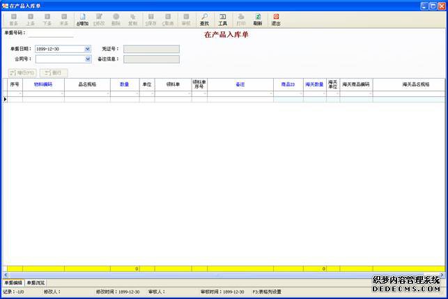 操作路徑:車間在制->在產(chǎn)品入庫單操作方法:單擊增加按鈕,然后選擇客戶資料,并通過增行和刪行按鈕選擇相應的產(chǎn)品料號,輸入數(shù)量等信息,然后保存并審核即可。