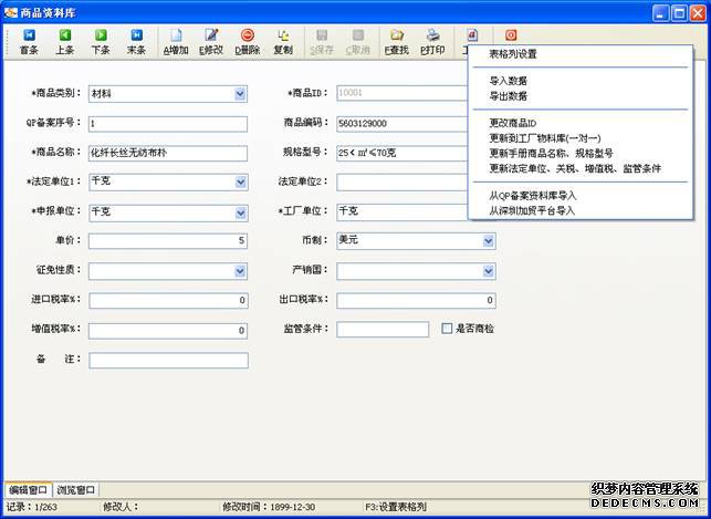 操作路徑:加工貿(mào)易->商品資料庫(kù)定義商品的類別,編碼,名稱,型號(hào)、稅率等。工具中可以設(shè)置表格列,從文檔中導(dǎo)入或?qū)⑸唐焚Y料導(dǎo)出到文檔,還可以更改商品ID,更新手冊(cè)商品名稱、規(guī)格型號(hào),更新法定單位、關(guān)稅、增值稅、監(jiān)管條件,一對(duì)一更新到工廠物料庫(kù),從QP備案資料庫(kù)導(dǎo)入,或者通過“深圳加貿(mào)平臺(tái)”直接導(dǎo)入商品資料庫(kù)。更快更方便。