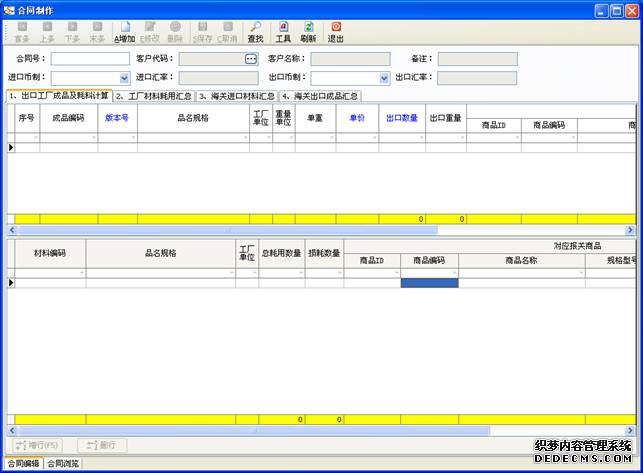 操作路徑: 加工貿(mào)易->手冊(cè)制作在手冊(cè)制作中,錄入備案合同。每本合同包括出口工廠成品及耗料計(jì)算、工廠材料耗料匯總、海關(guān)進(jìn)口材料匯總、海關(guān)出口成品匯總四個(gè)頁(yè)面。工具欄中的增加按鈕,是指增加一本新的合同,而要修改已有合同的內(nèi)容,如添加或減少進(jìn)口材料、出口成品和單損耗表、或者更改進(jìn)出口數(shù)量,則必須按修改按鈕。注意:刪除是指刪除整本合同。用戶可以通過增行和刪行按鈕自行增加或刪除需要進(jìn)出口的物料。