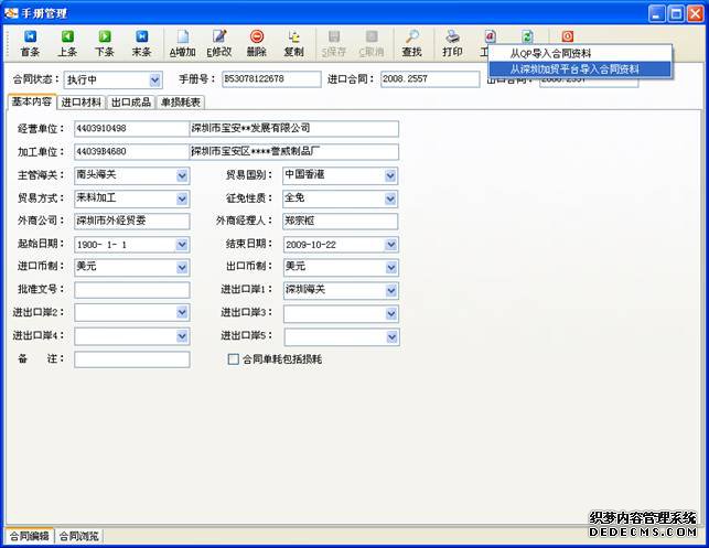 在手冊(cè)管理中,合同資料亦可從QP中導(dǎo)入或從深圳加貿(mào)平臺(tái)導(dǎo)入。