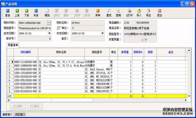 操作路徑:基礎(chǔ)資料->產(chǎn)品結(jié)構(gòu)BOM產(chǎn)品BOM表就是組成一個成品在生產(chǎn)過程中用到的所有物料部件的清單。相同類型的BOM表可以選擇復(fù)制來進行修改再生成新的單損耗表。做好BOM表在后面生成報表或查詢耗料對比時方便快捷。