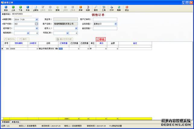 操作路徑:銷售管理->銷售訂單操作方法:?jiǎn)螕粼黾影粹o,然后選擇客戶資料,并通過增行和刪行按鈕選擇相應(yīng)的出貨料號(hào),輸入數(shù)量及單價(jià)信息,然后保存并審核即可。