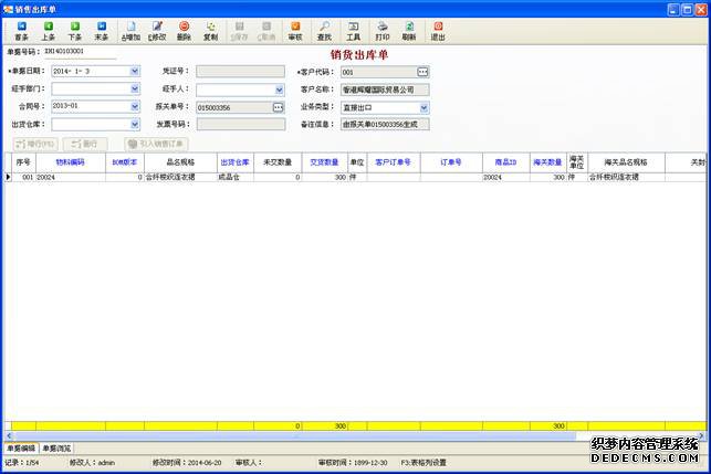 操作方法:?jiǎn)螕粼黾影粹o,然后選擇客戶資料,并通過增行和刪行按鈕選擇相應(yīng)的出貨料號(hào),輸入數(shù)量及單價(jià)信息,然后保存并審核即可。